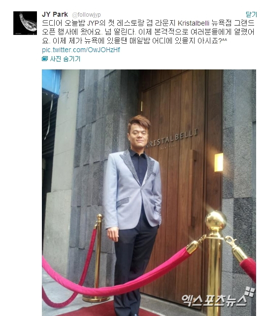 박진영은 27일 자신의 트위터에 "드디어 오늘밤 JYP의 첫 레스토랑 겸 라운지 Kristalbelli 뉴욕점 그랜드오픈 행사에 왔어요" 라는 글을 게재했다.