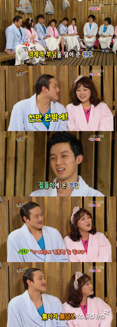 김원효는 허경환이 자신을 믿고 돈을 빌려줬기 때문에 지금 결혼해서 잘 살 수 있었다고 말하며 고마움을 표했다. 이에 허경환은 돈을 안 빌려주면 결혼을 못한다고 하는데 자신이 커플을 갈라서게 할 수는 없었다고 말하며 당시를 떠올렸다.