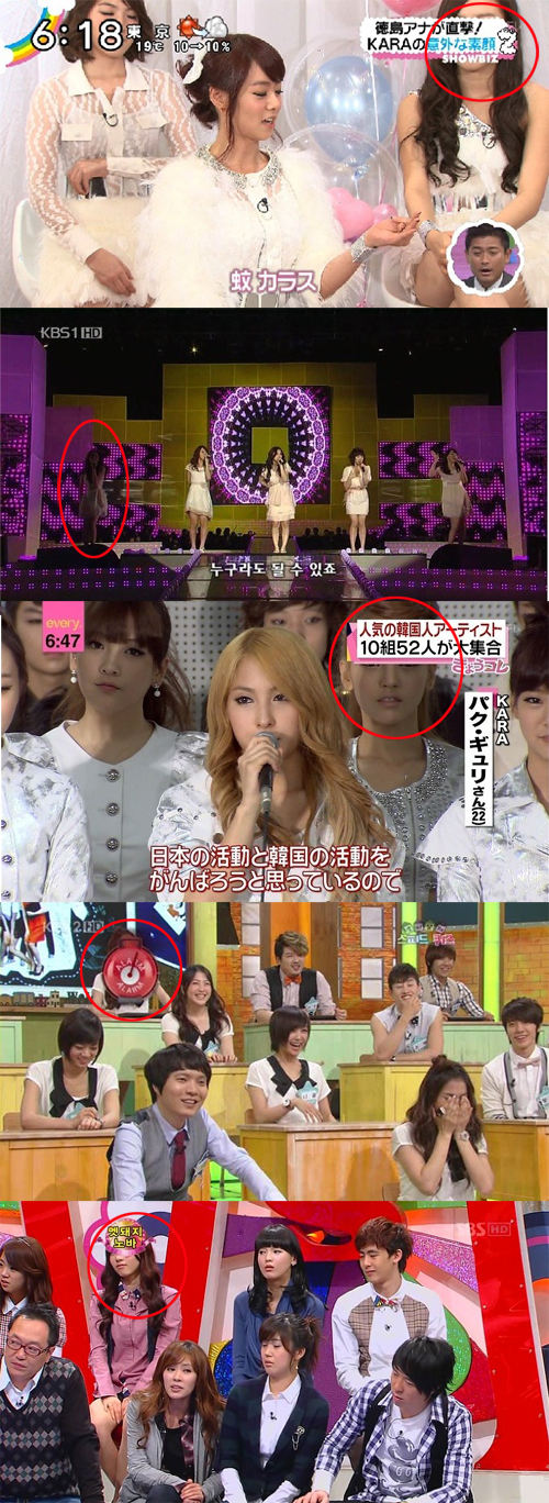 특히, 구하라는 한국뿐만 아니라 일본에서도 자리선정을 잘못하며 얼굴이 방송 로고에 가려져 눈길을 끈다.