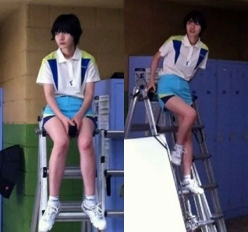사진 속에는 탁구 선수 유니폼을 입고 높은 사다리 위에 앉아 있는 배두나의 모습이 담겨 있다.