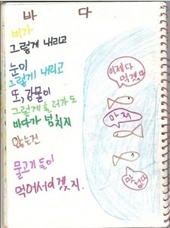사진은 한 초등학생이 바다를 주제로 쓴 시가 담겨있었다. 특히 바다가 넘치지 않는 이유가 '물고기 들을 먹어서'라는 답변은 네티즌들 사이에서 화제를 모으고 있다. 초등학생의 단순 명료하면서도 그럴듯한 답변은 아이의 순수한 시각을 보여준다.