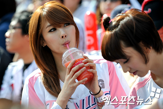 [엑스포츠뉴스=잠실, 권혁재 기자] 15일 오후 잠실야구장에서 열린 '2012 팔도 프로야구' LG 트윈스와 KIA 타이거즈의 경기에서 모델돌 나이뮤지스 멤버 현아가 관중석에서 경기를 관람하고 있다.