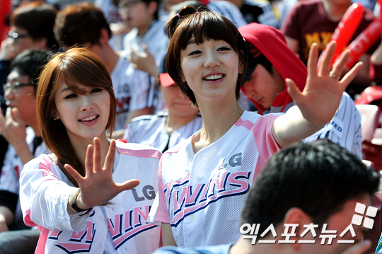 [엑스포츠뉴스=잠실, 권혁재 기자] 15일 오후 잠실야구장에서 열린 '2012 팔도 프로야구' LG 트윈스와 KIA 타이거즈의 경기에서 모델돌 나이뮤지스 멤버 현아와 은지가 관중석에서 경기를 관람하고 있다.