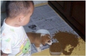 마치 강아지를 바라보며 "밥 하나 제대로 못 먹냐"고 충고하는 듯한 아기의 모습이 보는 이들의 웃음을 자아낸다.