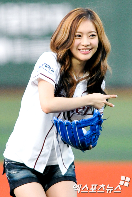 [엑스포츠뉴스=목동, 권혁재 기자] 17일 오후 목동야구장에서 열린 '2012 팔도 프로야구' 넥센 히어로즈와 KIA 타이거즈의 경기에 앞서 달샤벳 멤버 아영이 시구를 위해 포수와 싸인을 교환하고 있다.
