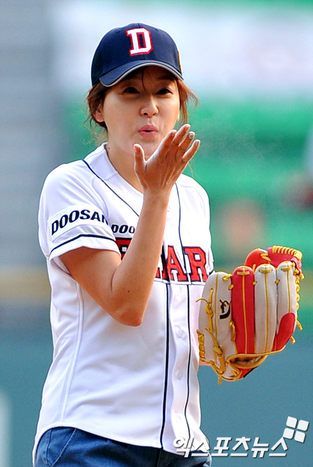 [엑스포츠뉴스=잠실, 권혁재 기자] 18일 오후 잠실야구장에서 열린 '2012 팔도 프로야구' 두산 베어스와 삼성 라이온즈의 경기에서 시구를 맡은 배우 박진희가 손에 묻은 로진을 입으로 불어내고 있다.