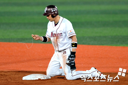 [엑스포츠뉴스=목동, 권혁재 기자] 20일 오후 목동야구장에서 열린 '2012 팔도 프로야구' 넥센 히어로즈와 두산 베어스의 경기에서 두산이 3-2로 앞선 6회말 무사 1, 3루 2루 도루에 성공한 넥센 이택근이 슬라이딩으로 인해 끊어진 목걸이를 쳐다보고 있다.
