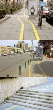 공개된 사진 모두에는 자전거 도로임을 표시하는 노란색 선이 있다. 그런데 이 자전거 도로임을 가리키는 노란색 선이 향한 곳은 계단, 간판 때문에 일반 사람도 지나가기 힘든 곳에 그려져 있는 것.