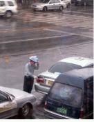 사진 속에는 택시기사 한 명이 비를 피하기 위해 택시의 위에 붙어있는 택시등을 떼서 쓰고 우산으로 활용하고 있다.