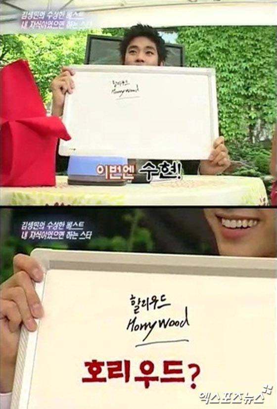 이날 방송에서 공개된 영상은 김수현이 지난 2008년 방송된 '해피선데이-이맛에산다'에 출연한 모습이다. 김수현은 당시 할리우드를 영어로 쓰는 문제에 대해 '호리우드(Horry wood)'라는 오답을 적었다.