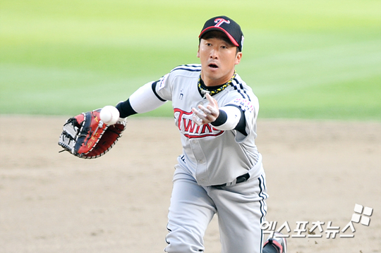 [엑스포츠뉴스=잠실, 권혁재 기자] 19일 오후 잠실야구장에서 열린 '2012 팔도 프로야구' 두산 베어스와 LG 트윈스의 경기에서 LG가 3-0으로 앞선 4회말 LG 1루수 작은 이병규가 두산 김현수의 땅볼 타구를 잡아 1루로 달려오는 리즈를 향해 공을 던지고 있다.