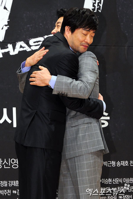 [엑스포츠뉴스 = 권태완 기자] 24일 오후 서울 목동SBS에서 열린 SBS 월화드라마 '추적자' 제작발표회에 손현주(왼쪽)와 김상중이 함께 사진을 찍던 중 포옹을 해 좌중에 웃음이 터졌다.