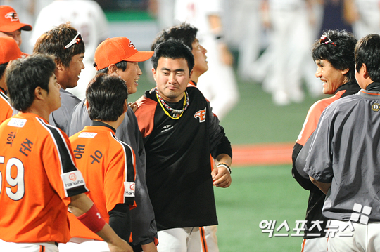 승리를 거둔 한화 선수들이 승리투수 안승민에게 축하를 해주고 있다.