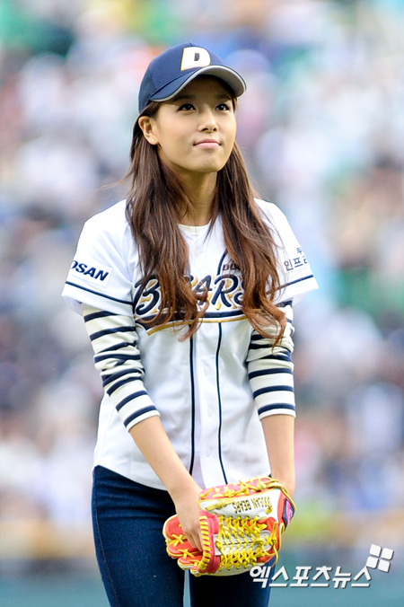[엑스포츠뉴스=잠실, 권혁재 기자] 27일 오후 잠실야구장에서 열린 '2012 팔도 프로야구' 두산 베어스와 롯데 자이언츠의 경기에서 시구를 맡은 원더걸스 멤버 유빈이 마운드에서 시구를 하고 있다.
