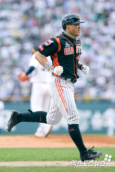 [엑스포츠뉴스=잠실, 권혁재 기자] 27일 오후 잠실야구장에서 열린 '2012 팔도 프로야구' 두산 베어스와 롯데 자이언츠의 경기에서 1회초 1아웃 1, 2루 우중간 담장을 넘긴 롯데 홍성흔이 홈을 향해 달리고 있다.