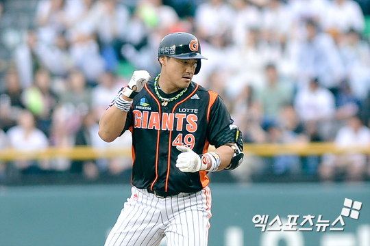 [엑스포츠뉴스=잠실, 권혁재 기자] 27일 오후 잠실야구장에서 열린 '2012 팔도 프로야구' 두산 베어스와 롯데 자이언츠의 경기에서 롯데가 4-0으로 앞선 2회초 2아웃 2루 상황, 롯데 홍성흔이 우중간 1타점 적시타를 날리고 1루에서 환호하고 있다.