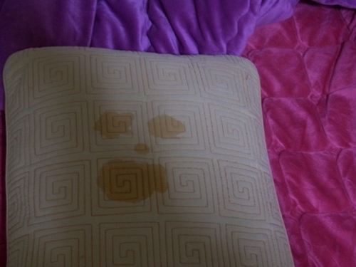 공개한 사진 속에는 군데군데가 젖어서 얼룩이 져 있는 베개의 모습이 담겨 있다.