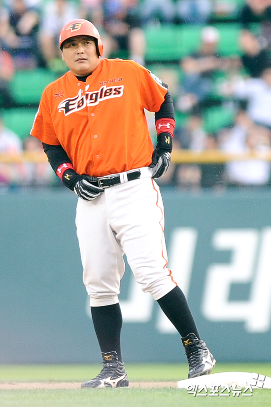 [엑스포츠뉴스=잠실, 권혁재 기자] 1일 오후 잠실야구장에서 열린 '2012 팔도 프로야구' LG 트윈스와 한화 이글스의 경기에서 1회초 1아웃 1, 3루 한화 김태균이 좌중간 1타적 적시타를 날리고 2루에서 유니폼을 정리하고 있다.