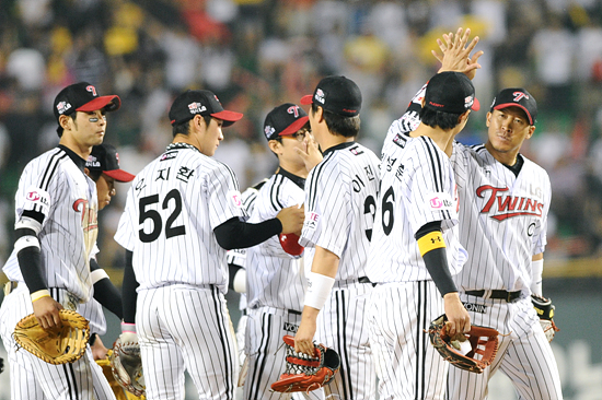 승리를 거둔 LG 선수들이 마운드에 모여 하이파이브 나누고 있다.