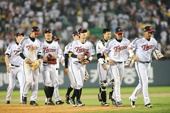 승리를 거둔 LG 선수들이 마운드에서 하이파이브를 나누고 덕아웃으로 들어가고 있다.