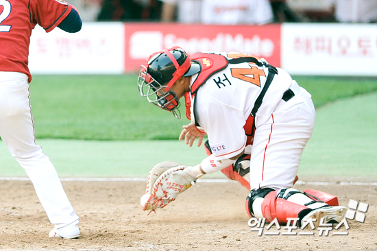 [엑스포츠뉴스=문학, 권혁재 기자] 3일 오후 인천 문학야구장에서 열린 '2012 팔도 프로야구' SK 와이번스와 KIA 타이거즈의 경기에서 SK가 1-0으로 앞선 4회초 1아웃 만루 SK 투수 윤희상의 원바운드 투구를 포수 조인성이 몸을 던지며 잡아내고 있다.
