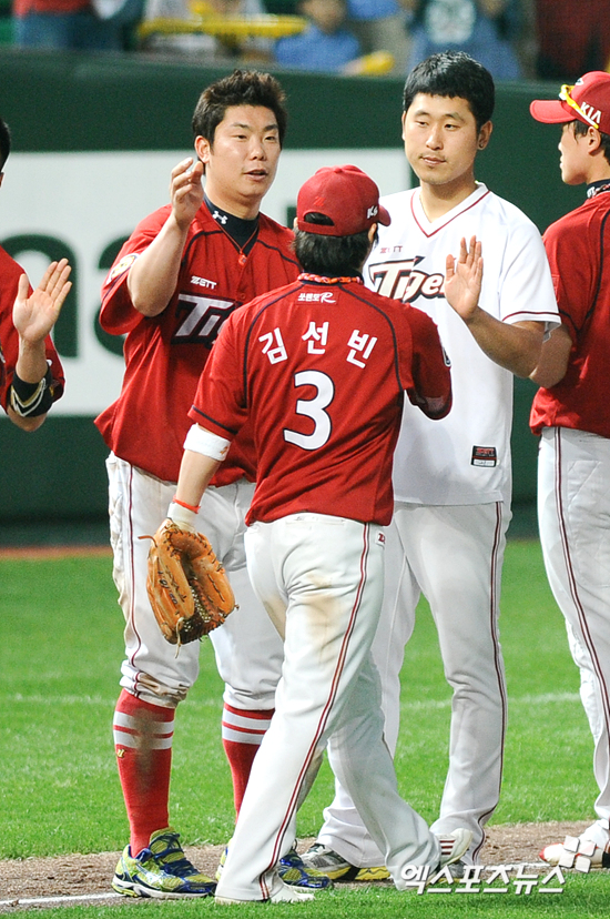 승리를 거둔 KIA 김선빈이 나지완, 윤석민과 하이파이브를 나누고 있다.