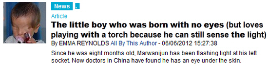 6일(현지시각) 영국 일간지 데일리메일은 '눈이 없이 태어난 작은 아이'라는 제목의 기사를 보도했다. 데일리메일은 "이 아기는 생후 8개월로 중국 우루무치에서 태어났다. 태어날 때부터 눈이 있어야 할 자리에 얇은 피부막이 덮여 있었다"고 보도했다.