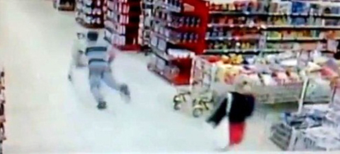 공개된 동영상은 한 여성과 함께 장을 보러 나온 남성이 카트에 올라타려고 장난을 치다가 바닥으로 넘어진 장면을 담고 있다.