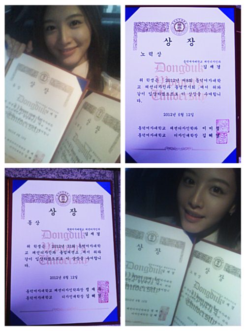 공개된 사진 속 김재경은 밝게 웃으며 동상 상장을 들고 있다. 특히, 상장에는 '동덕여자대학교 패션디자인학과에서 수여하는 노력상'이라는 글이 적혀 있어 눈길을 끈다.