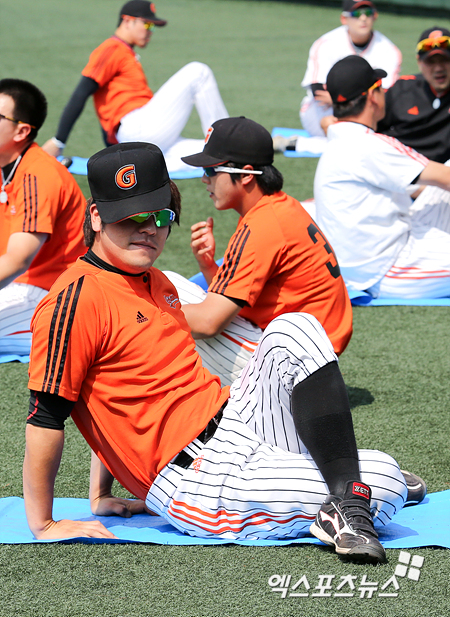 [엑스포츠뉴스=목동, 권혁재 기자] 16일 오후 목동구장에서 '2012 팔도 프로야구' 넥센 히어로즈와 롯데 자이언츠의 경기가 열릴 예정인 가운데 팀 훈련 시간에 강민호가 따가운 햇살을 피하기 위해 모자를 쓰고 스트레칭 하고 있다.