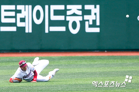 [엑스포츠뉴스=목동, 권혁재 기자] 16일 오후 목동구장에서 '2012 팔도 프로야구' 넥센 히어로즈와 롯데 자이언츠의 경기에서 롯데가 2-0으로 앞선 2회초 1아웃 2루 넥센 좌익수 장기영이 롯데 김주찬의 타구를 잡기 위해 슬라이딩 하였지만 공은 뒤로 빠지고 있다. 타자주자 김주찬은 3루까지.