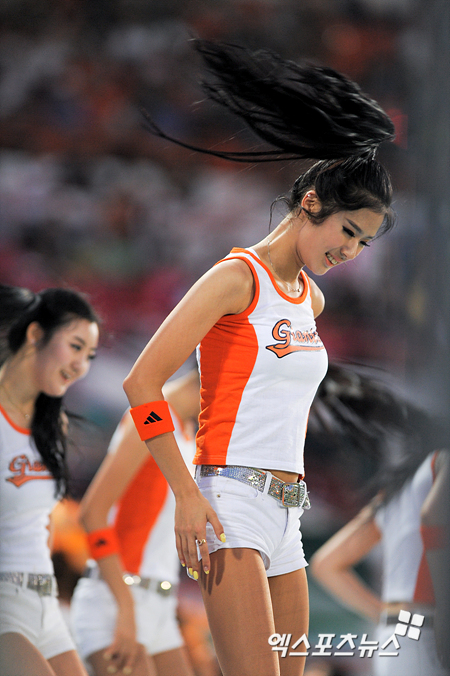 [엑스포츠뉴스=목동, 권혁재 기자] 16일 오후 목동구장에서 '2012 팔도 프로야구' 넥센 히어로즈와 롯데 자이언츠의 경기에서 롯데 여신으로 유명세를 타고 있는 롯데 치어리더 박기량이 신나는 응원 댄스를 선보이고 있다.