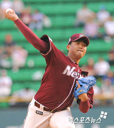 [엑스포츠뉴스=잠실, 권혁재 기자] 19일 오후 잠실구장에서 열린 '2012 팔도 프로야구' 두산 베어스와 넥센 히어로즈의 경기에서 넥센 선발투수 김영민이 힘차게 공을 던지고 있다.