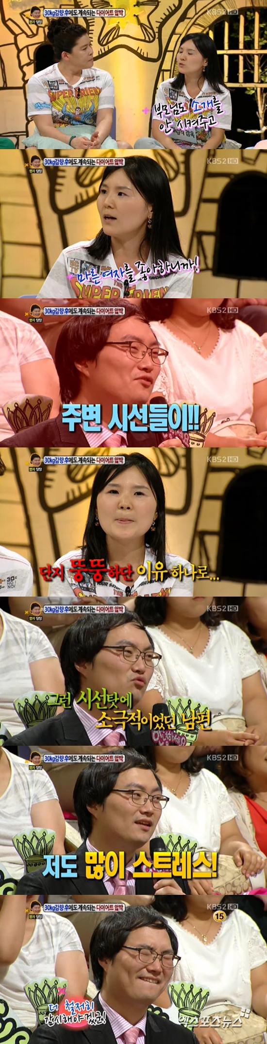 사연의 주인공은 "결혼하기 전에 체중이 75kg 정도였다. 결혼하기 위해 30kg을 감량했다. 하지만 이후 남편은 46kg을 유지시키기 위해 저녁밥도 못 먹게 한다"고 밝혀 모두를 경악하게 만들었다.