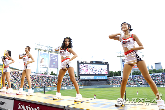 [엑스포츠뉴스=잠실, 권혁재 기자] 26일 오후 잠실구장에서 열린 '2012 팔도 프로야구' LG 트윈스와 KIA 타이거즈의 경기에서 KIA 치어리더들이 섹시한 안무를 선보이고 있다.
