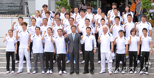 [엑스포츠뉴스=태릉, 권혁재 기자] 27일 오전 서울 노원구 공릉동 태릉선수촌에서 열린 '2012 런던올림픽 D-30 공식 미디어데이' 행사에 참석한 국가대표 선수들과 임원들이 포토타이믈 갖고 있다.