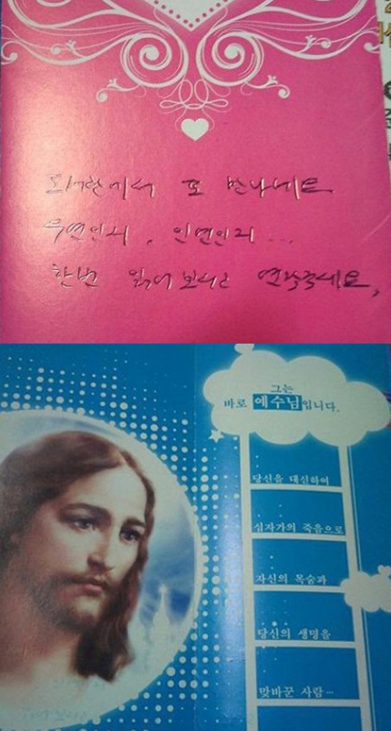 하지만 해당 '도서관 훈훈한 쪽지'에는 반전이 숨어 있었다. 쪽지 안에는 어느 교회의 홍보물이 담겨 있어 보는 이들에게 웃음을 선사했다.