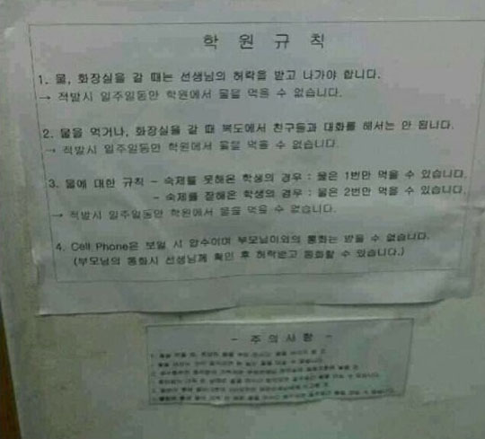해당 게시물에는 '1. 물을 마시거나 화장실에 갈 때는 선생님의 허락을 받고 해야 한다', '2. 물을 마시거나 화장실을 갈 때 복도에서 대화를 나눌 수 없다', '3. 물에 대한 규칙: 숙제를 못해온 학생의 경우-물은 1번만 먹을 수 있다, 숙제를 잘해온 학생의 경우-물은 2번만 먹을 수 있다', '4. 휴대폰은 보일 시 압수이며 부모님 이외의 통화는 받을 수 없다' 등의 조항이 담겨 있다.