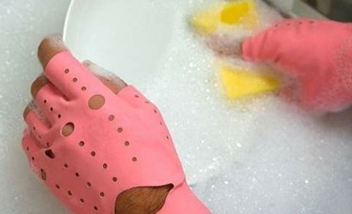 공개한 사진 속에는 독특한 디자인의 고무장갑을 끼고 설거지를 하고 있는 모습이 담겨 있다.