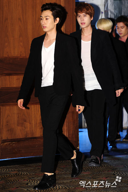 [엑스포츠뉴스 = 권태완 기자] 3일 오전 서울 논현동 임피리얼팰리스호텔에서 열린 슈퍼주니어 6집 'Sexy, Free & Single' 컴백 기자간담회에 은혁과 규현이 함께 입장하고 있다.