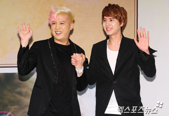 [엑스포츠뉴스 = 권태완 기자] 3일 오전 서울 논현동 임피리얼팰리스호텔에서 열린 슈퍼주니어 6집 'Sexy, Free & Single' 컴백 기자간담회에 신동(왼쪽)과 규현이 손을 잡고 인사를 하고 있다.