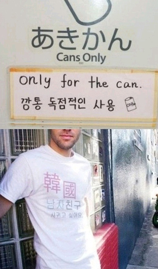 캔만 버리라고 표시돼 있는 쓰레기통에는 누군가가 한국어로 '깡통 독점적인 사용'이라는 다소 엉뚱한 해석을 적어놓아 보는 이들을 당황하게 하고 있고, 한 남성이 입고 있는 티셔츠에는 '한국 남자친구 사귀고 싶어요'라는 글귀가 적혀 있어 웃음과 함께 잘못 쓰이는 한글에 대한 아쉬움을 함께 느끼게 해 주고 있다.