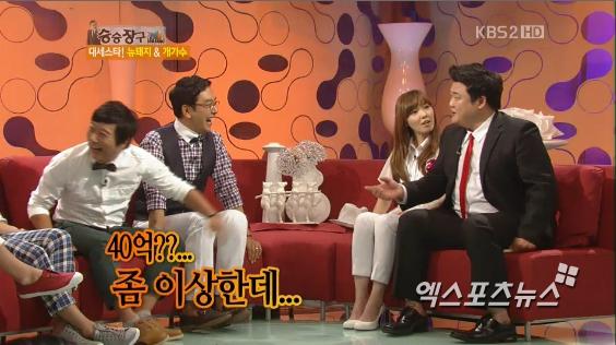 이에 이수근은 회당 수입료에 곱하기를 하며 "그러면 40억 정도?"라고 물었고, 김준현은 당황하며 "아닌데… 삼, 삼억 정도"라고 실수입을 털어놨다.
