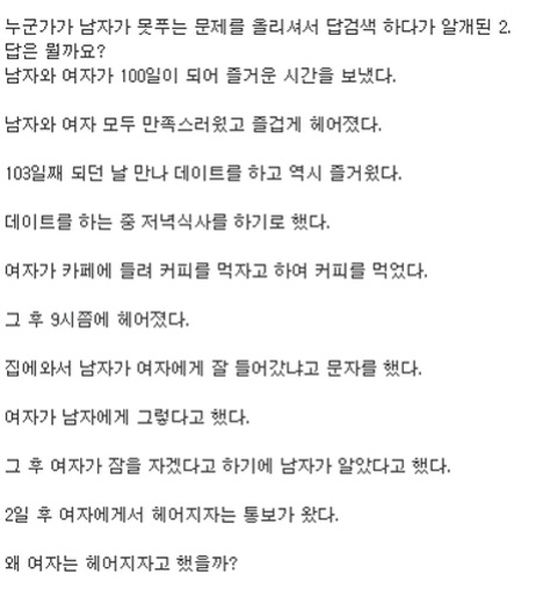 공개된 '남자는 못 푸는 문제 2탄' 게시물에 따르면 한 남성은 자신의 여자친구와 100일, 103일 데이트를 가졌다.