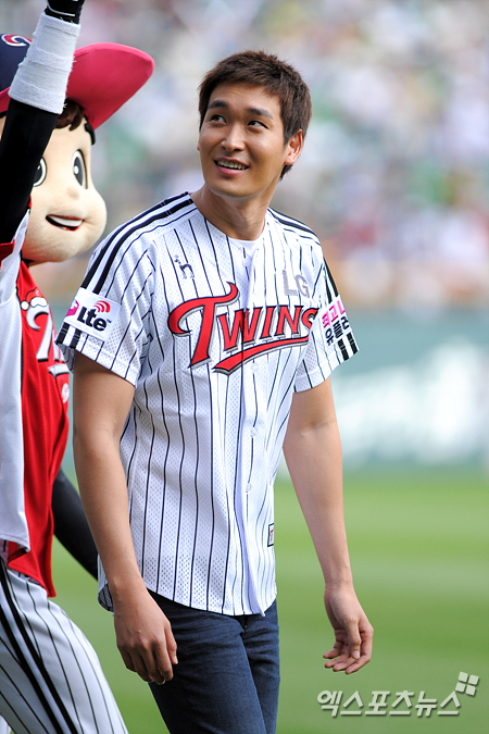 [엑스포츠뉴스=잠실, 권혁재 기자] 7일 오후 잠실구장에서 열린 '2012 팔도 프로야구' LG 트윈스와 두산 베어스의 경기에 앞서 배우 정겨운이 시구를 위해 그라운드에 입장하고 있다.