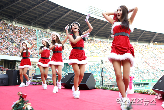 [엑스포츠뉴스=잠실, 권혁재 기자] 7일 오후 잠실구장에서 열린 '2012 팔도 프로야구' LG 트윈스와 두산 베어스의 경기에서 썸머 크리스마스를 맞아 산타 복장을 한 LG 치어리더들이 열띤 응원을 펼치고 있다.