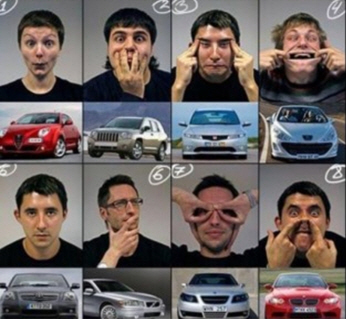 공개한 사진 속에는 다양한 종류의 자동차 앞에서 차의 표정을 흉내 내고 있는 외국 남성들의 모습이 담겨 있다.