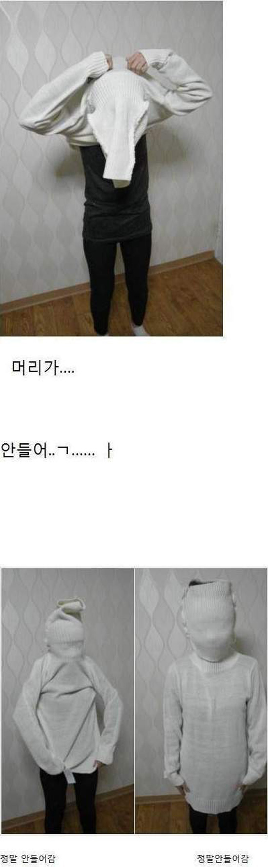 공개된 사진에는 한 여성이 옷을 입으려고 노력했지만 목이 들어가지 않아 난감한 상황에 빠져있는 모습이 담겨 있다.
