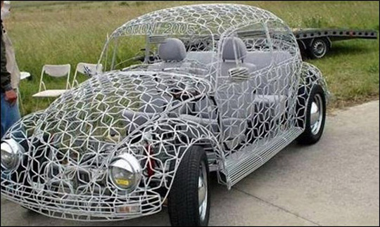 공개된 사진에서 차량은 차체 모두를 회색 철근으로 엮어 만들어 외부가 뻥 뚫려 있어 내부 구조를 훤히 들여다 볼 수 있는 모습이다.