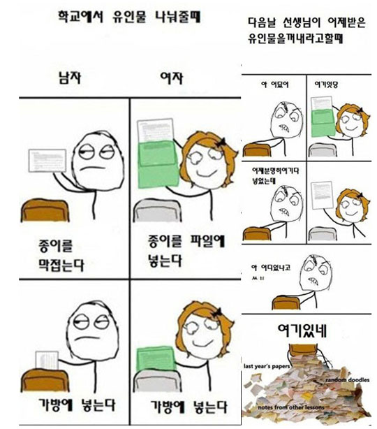 해당 게시물은 학교에서 유인물을 나눠줬을 때 남녀학생의 각기 다른 유인물 간수 방식에 대해 그린 웹툰이다.